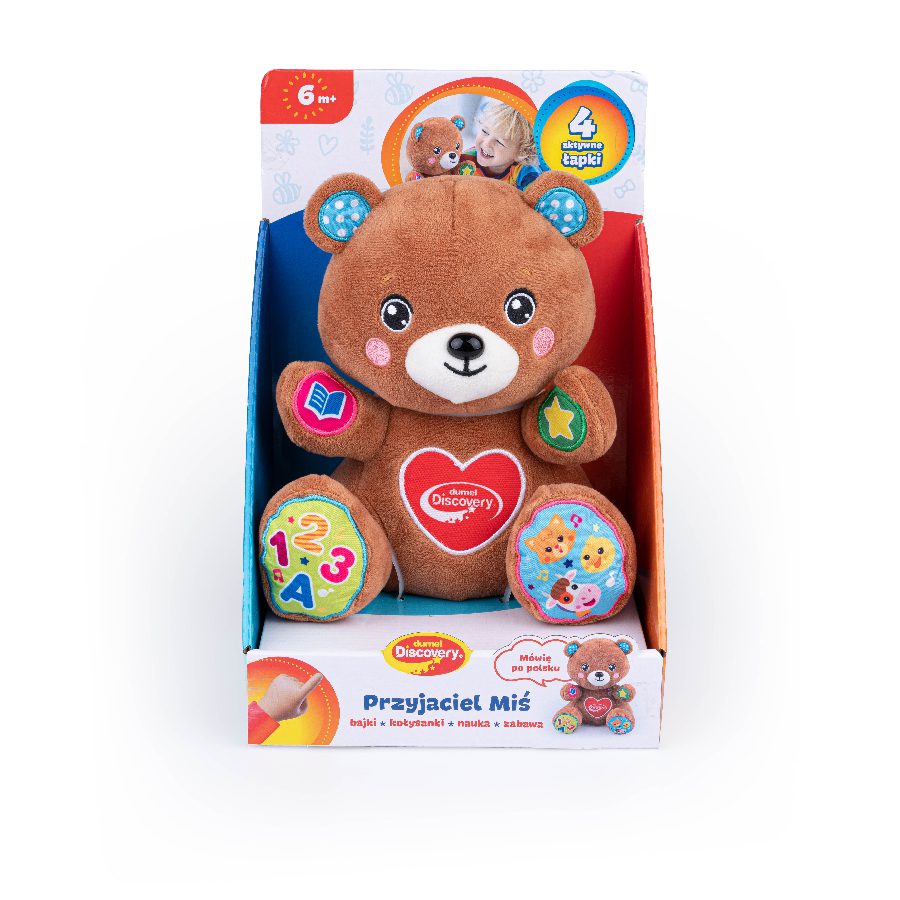 Ar žinojote, kad yra būdas persikelti į saugų vaizduotės pasaulį neišėjus iš namų? Tvirtai apkabink meškiuką ir spausk jo letenas, kad kartu su juo atrastum nuostabius pasakų kraštus, išmoktų abėcėlę, skaičius ir susipažintum su gyvūnais. Kiekviena meškiuko letenėlė turi skirtingą staigmeną! Be pasakų, rasite ir lopšinių, dainelių lenkų kalba, eilėraščių ir linksmų frazių. Mažylis visada gali su savimi turėti meškiuką. Dieną pliušinis draugas jam parūpins nuotaikingų pramogų, o vakare pasakos ar pagros saldžią lopšinę miegoti.